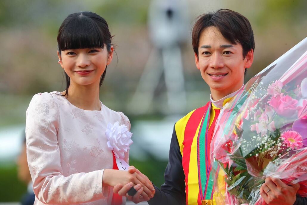 桜花賞を勝利した松山弘平騎手とJRA年間プロモーションキャラクターを務める見上愛 (C)masamasa