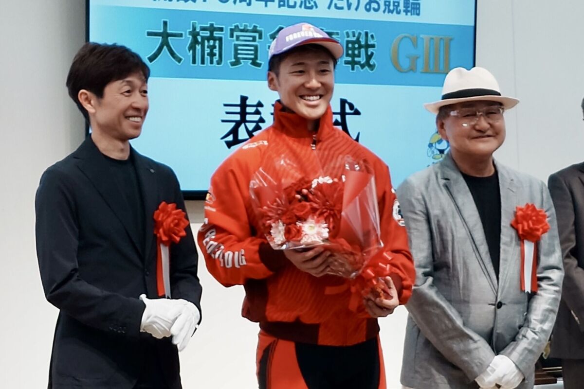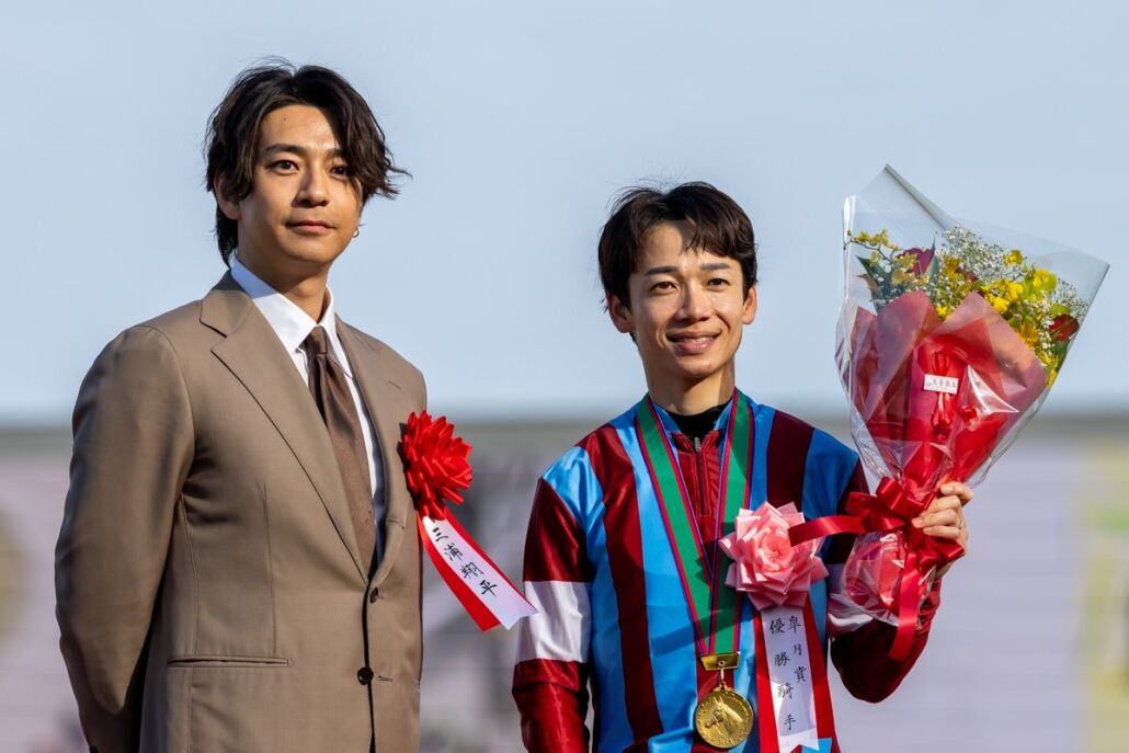 表彰式プレゼンターを務めた三浦翔平さんとロブチェンで勝利した松山弘平騎手