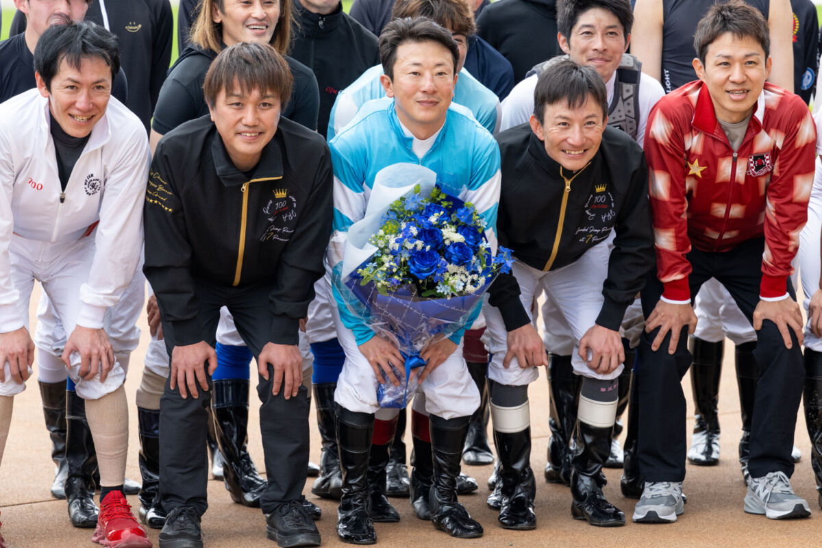 ラスト騎乗を終えた石神深一騎手と騎手一同