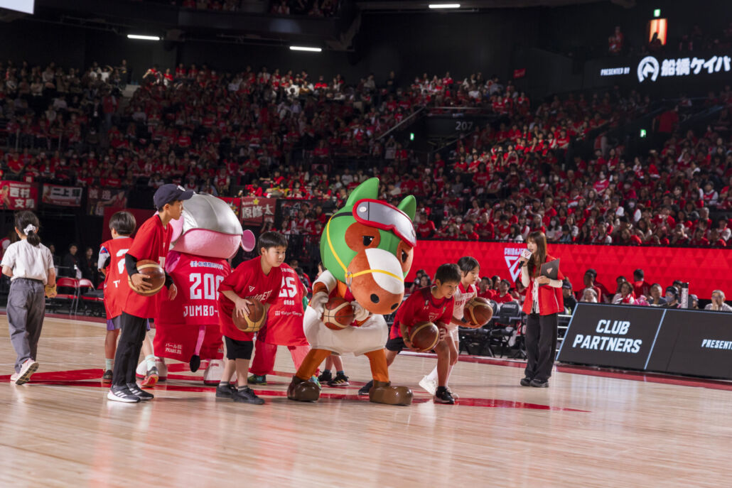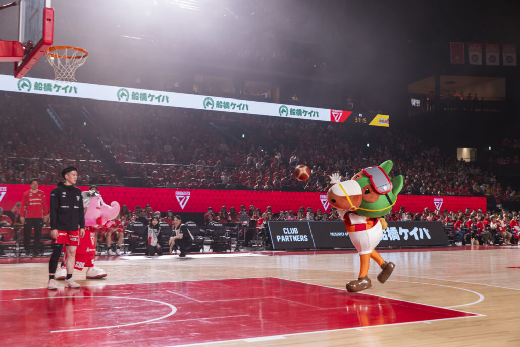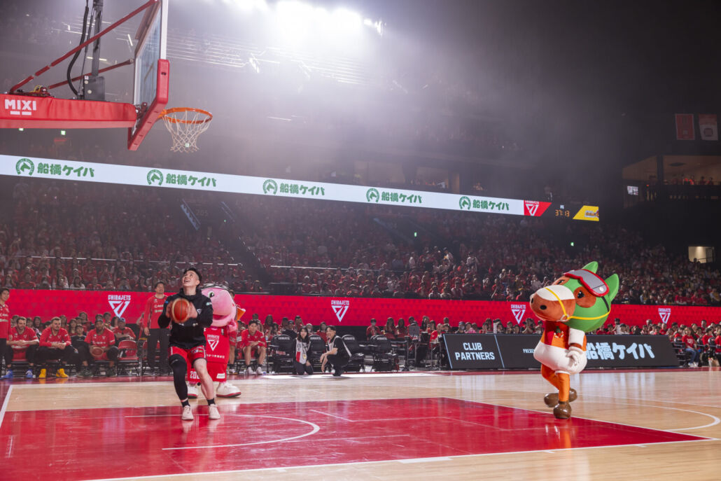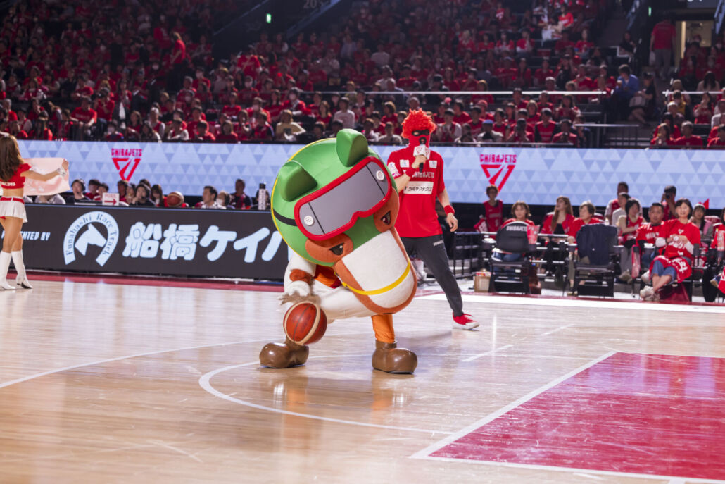 千葉ジェッツの選⼿とキャロッタ、ジャンボくん
