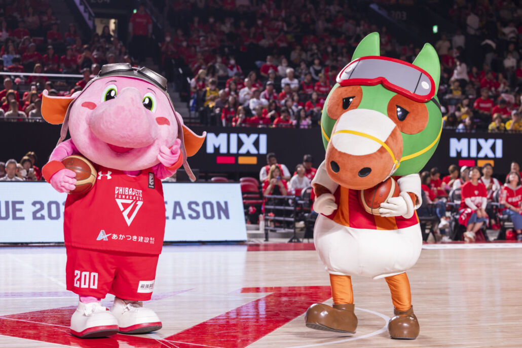 (左から)千葉ジェッツの公式マスコットキャラクター「ジャンボくん」と船橋競⾺場の公式マスコットキャラクター「キャロッタ」
