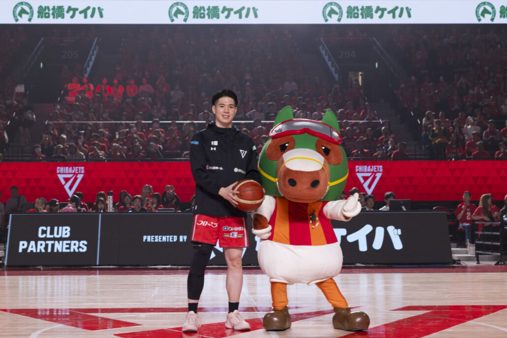 千葉ジェッツの瀬川琉久選⼿と船橋競⾺場の公式マスコットキャラクター「キャロッタ」