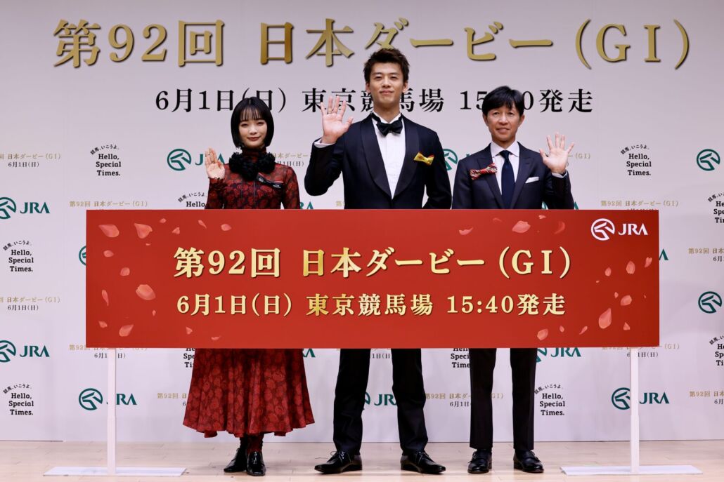 日本ダービーのPR発表会に出席した見上愛・竹内涼真・武豊騎手 (C)Hiroki Homma