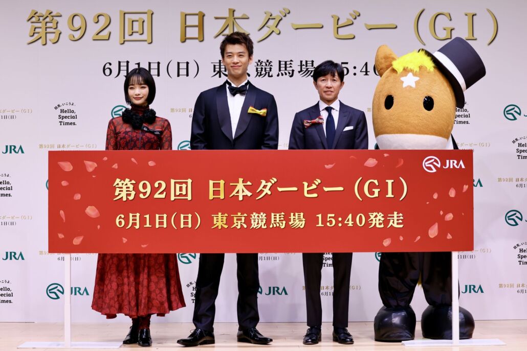 日本ダービーのPR発表会に出席した見上愛・竹内涼真・武豊騎手・ターフィーくん (C)Hiroki Homma