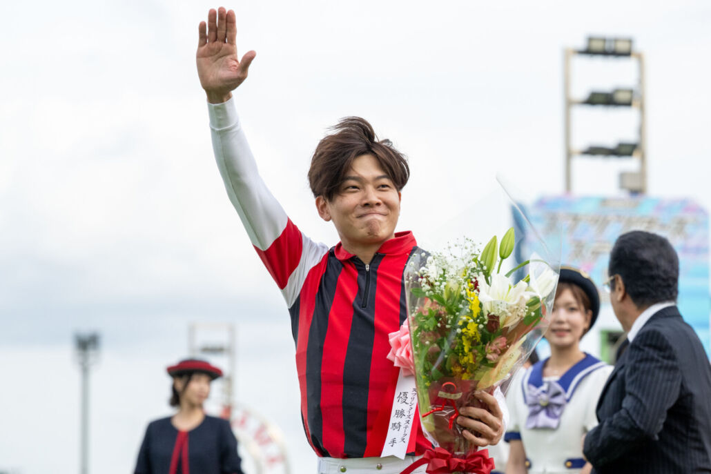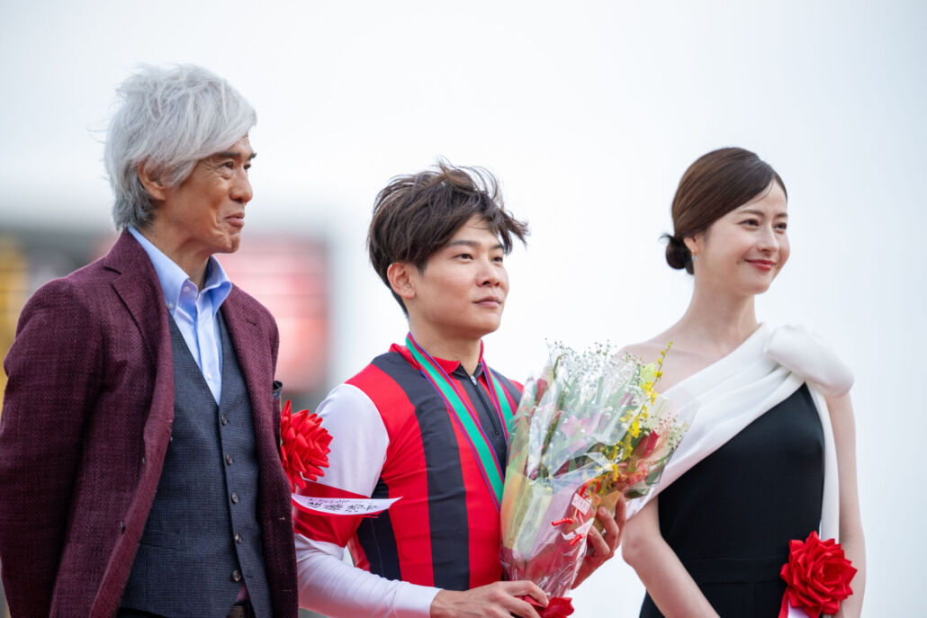 三浦皇成騎手と表彰式プレゼンターを務めた佐藤浩市さん、松本若菜さん