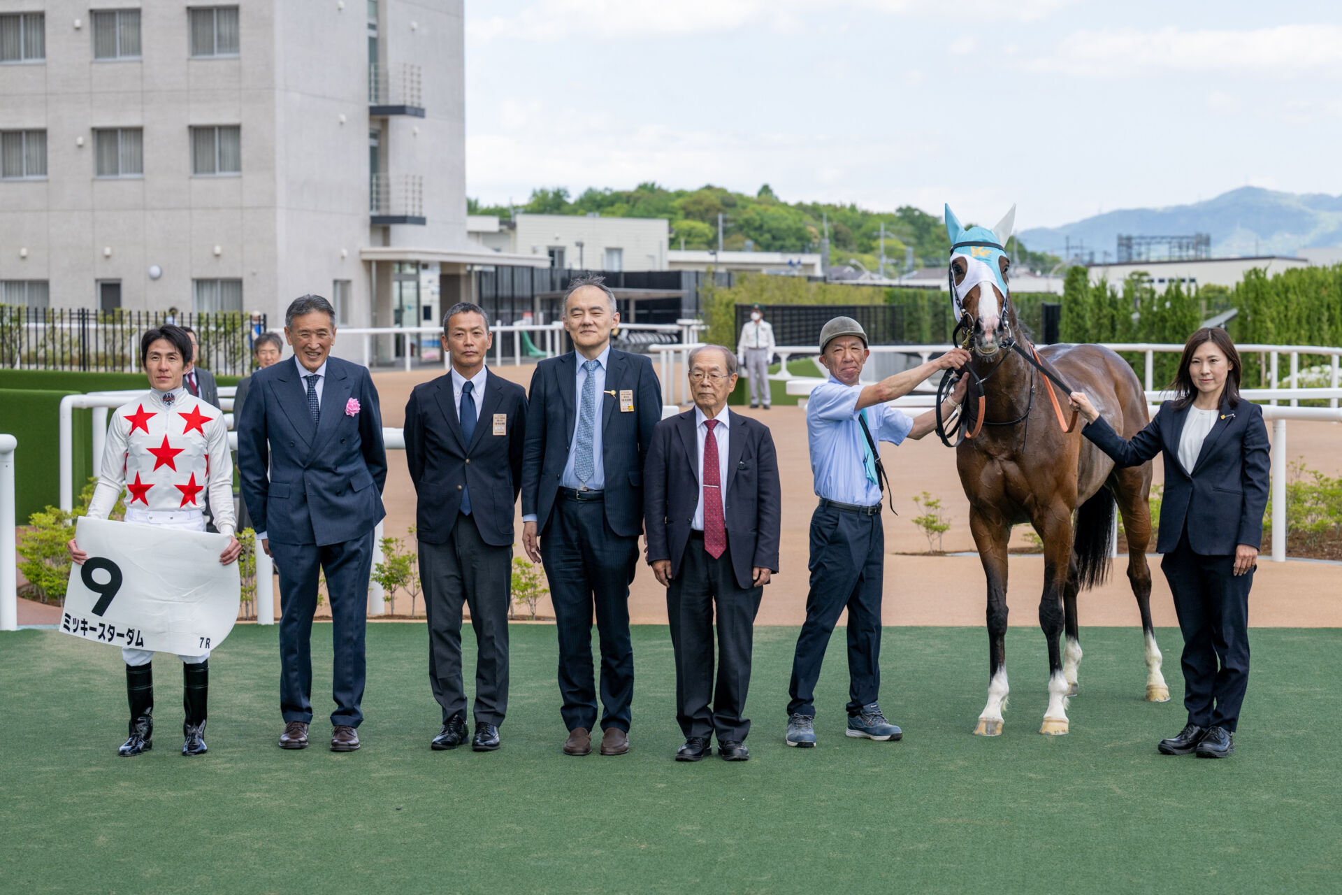 5月4日、京都競馬場で行われた7R・4歳上1勝クラス(ダ1600m)は、丹内祐次騎乗の4番人気、ミッキースターダム(せん4・栗東・前川恭子)が快勝した。2馬身差の2着にマーシーラン(牝4・栗東・渡辺薫彦)、3着に2番人気のジャズ(牡4・栗東・辻野泰之)が入った。勝ちタイムは1:34.0(良)。