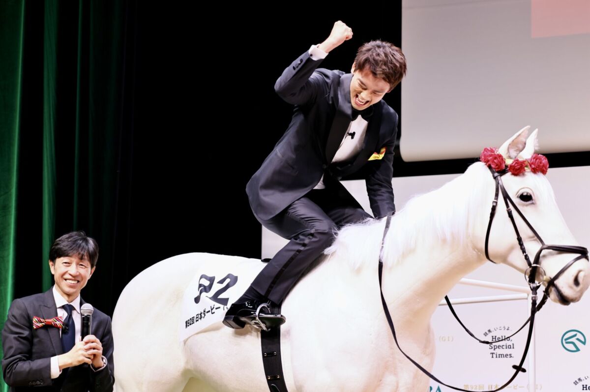 第92回日本ダービーのPR発表会が5月26日に都内で開催され、JRA年間プロモーションキャラクターの竹内涼真が登壇。競馬初心者ながら、競馬界のレジェンド武豊騎手や俳優の見上愛とともに、日本ダービーの魅力を身体で“体感”した。 イベントでは、武豊・見上愛とともにダービーの知識をクイズ形式で学ぶコーナーや、ジョッキー姿勢を再現する乗馬体験、さらには競走馬の平均速度を再現する“ダービーレコードチャレンジ”に挑戦。 スーツ姿で全力疾走 ドウデュースが記録したダービーレコード(2分21秒9、平均時速約60km)...