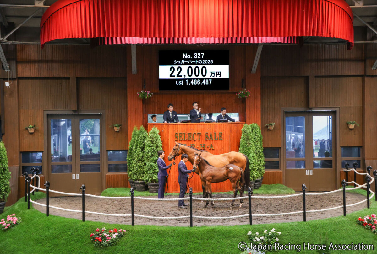 7月15日、北海道苫小牧にあるノーザンホースパークで、日本最大のサラブレッド市場「セレクトセール2025」の2日目が開幕。当歳馬セールにて上場番号327番・シュガーハートの2025(牡)が2億2000万円で落札された。 【セレクトセール2025】イクイノックス産駒が初登場!2億3000万円で落札 Y's consignment salesが落札 シュガーハートの2025は、父コントレイル、母シュガーハート、母父サクラバクシンオーという血統。生産牧場はヤナガワ牧場で、キタサンブラックの半弟。購買者はY's...