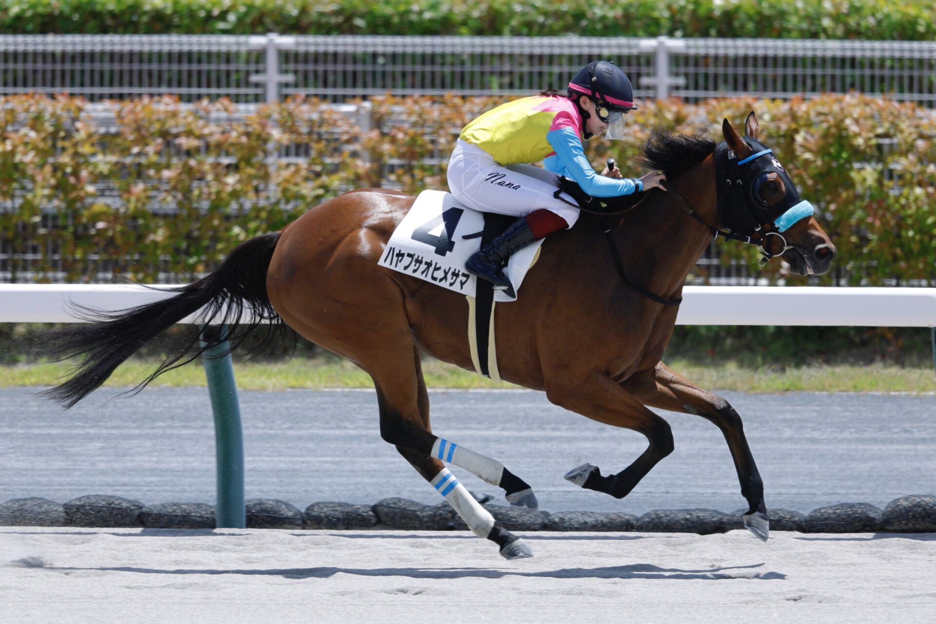 河原田菜々騎乗の2番人気、ハヤブサオヒメサマが嬉しい初勝利を決めた。同騎手は今年の3勝目。レースではゲートを勢いよく飛び出して先頭へ。軽量51キロを活かして軽快な逃げ脚を飛ばしていくと、直線でもセーフティリードを奪ってそのまま押し切った。