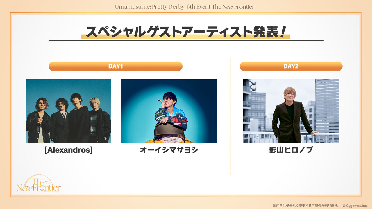 Cygamesは、クロスメディアコンテンツ『ウマ娘 プリティーダービー』の大型イベント「6th EVENT The New Frontier」秋公演(10月18日・19日/さいたまスーパーアリーナ)に、スペシャルゲストアーティストとして[Alexandros]、オーイシマサヨシ、影山ヒロノブが出演すると発表した。