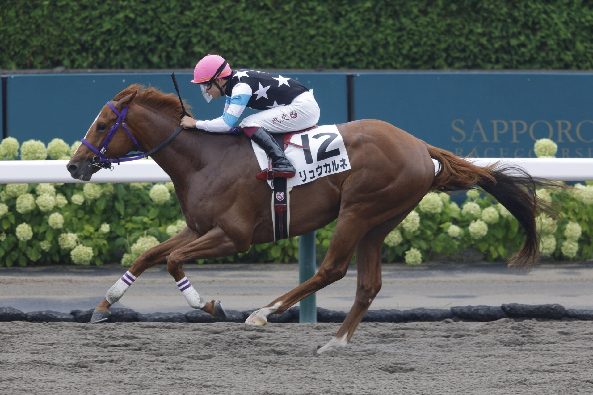 8月30日、札幌競馬場で行われた5R・2歳新馬戦(ダ1700m)は、横山武史騎乗の1番人気、リュウカルネ(牡2・美浦・伊藤圭三)が快勝した。3.1/2馬身差の2着にケイアイアギト(牡2・美浦・加藤征弘)、3着に2番人気のセスティーナ(牡2・栗東・須貝尚介)が入った。勝ちタイムは1:46.3(重)。