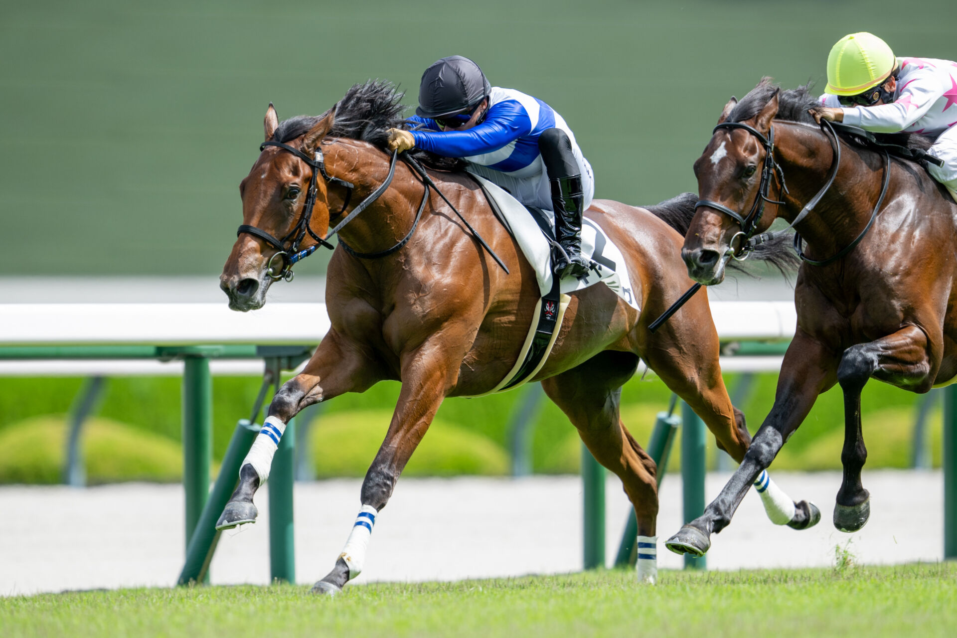 川田将雅騎乗の2番人気、ギャラボーグが嬉しい初勝利を飾った。レースでは少頭数5頭立ての2番手から。直線の瞬発力勝負で、断然人気のマテンロウゲイルとの追い比べに。最後まで先頭を譲らず、33.0の末脚を繰り出して終いをまとめた。同馬はNHKマイルカップを勝利したダノンスコーピオンの全妹。