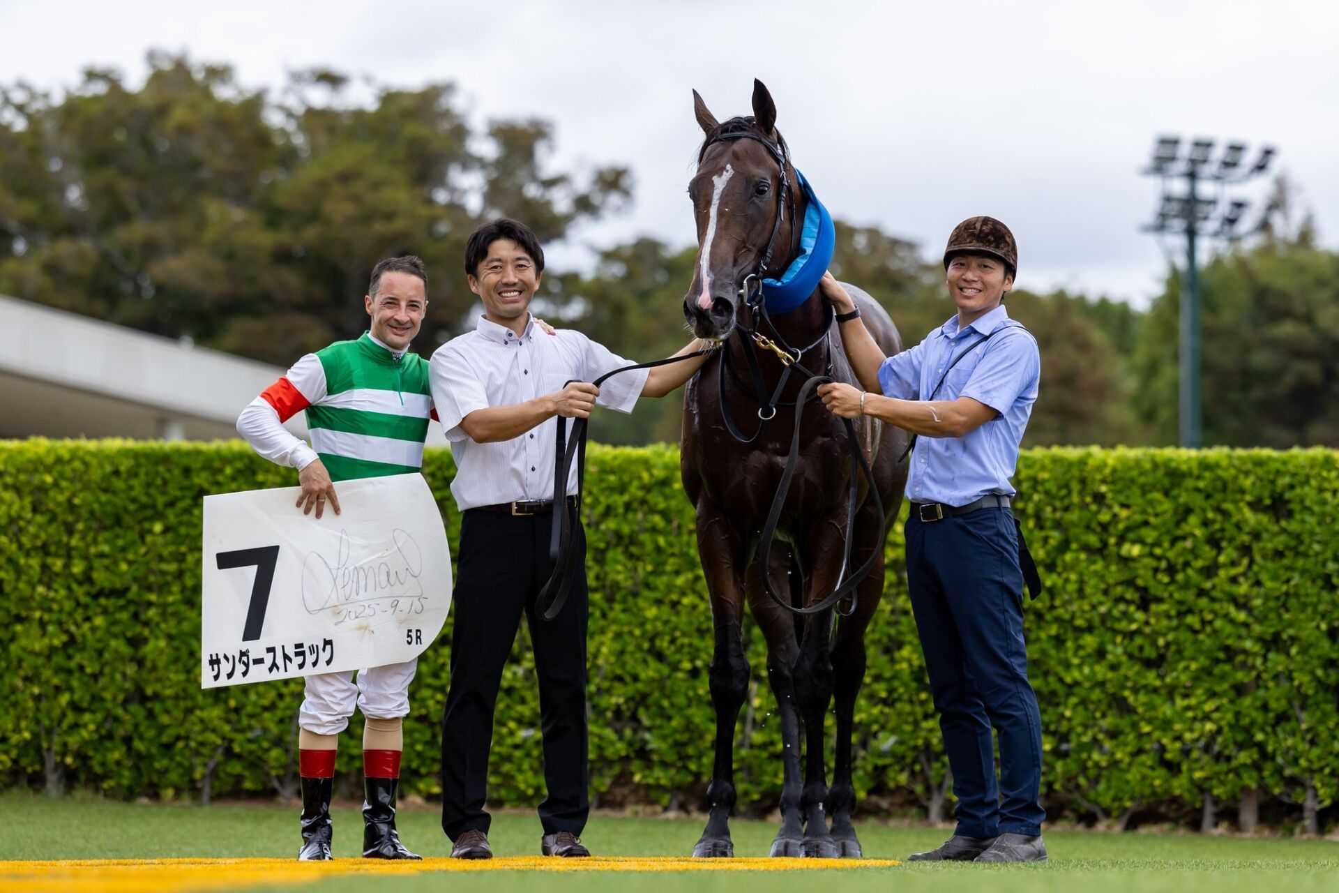 9月15日、中山競馬場で行われた5R・2歳新馬戦(芝1600m)は、C.ルメール騎乗の2番人気、サンダーストラック(牡2・美浦・木村哲也)が勝利した。ハナ差の2着にアースヴィンチ(牝2・美浦・蛯名正義)、3着にタナスーペルノーバ(牡2・栗東・寺島良)が入った。勝ちタイムは1:36.9(良)。