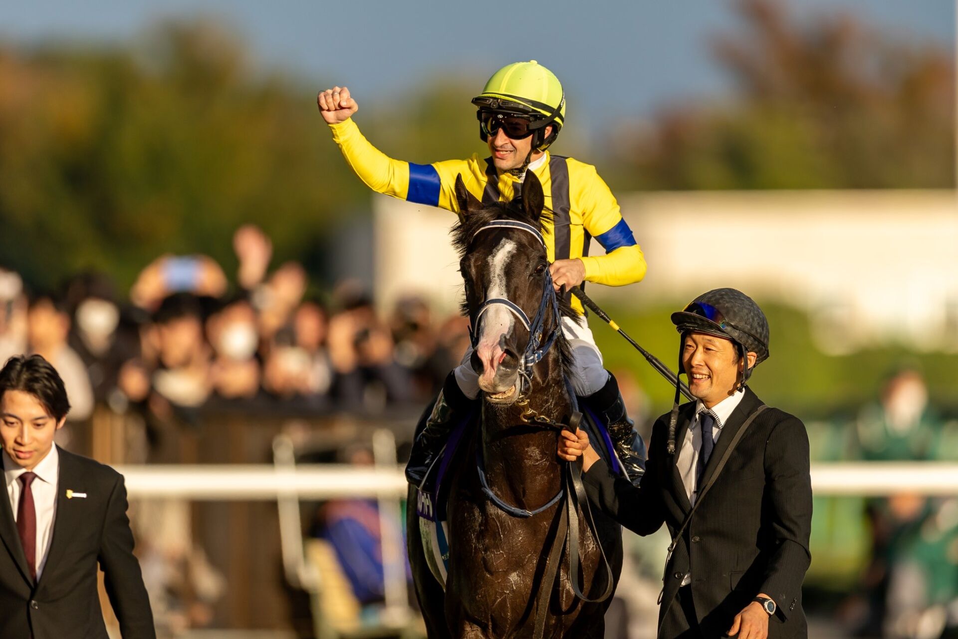 「気持ちがすごくいいです。本当に嬉しいです。タスティエーラの後ろでいいところでした。タスティエーラをマークしました。坂を登ってからマスカレードボールが自分の見つけました。もう一度加速してゴールまですごくいい脚を使ってくれて素晴らしかったです。ダービー2着でいいパフォーマンスをしましたが、秋になって大人になりましたし、強くもなりました。来年絶対トップレベルで使っていけると思います。本当にありがとうございました」