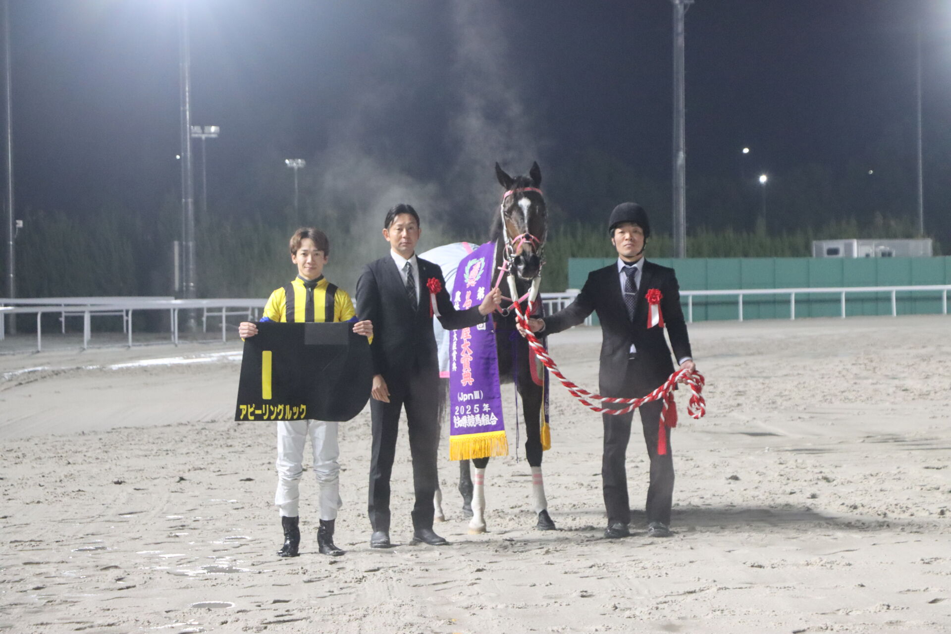 12月24日、名古屋競馬場で行われた10R・名古屋大賞典(Jpn3・3歳上・ダ2000m)は、松山弘平騎乗の5番人気、アピーリングルック(牝4・美浦・辻哲英)が勝利した。1/2馬身差の2着に1番人気のカズタンジャー(牡4・栗東・新谷功一)、3着にデルマソトガケ(牡5・栗東・須貝尚介)が入った。勝ちタイムは2:06.2のレコードタイム(不良)。
