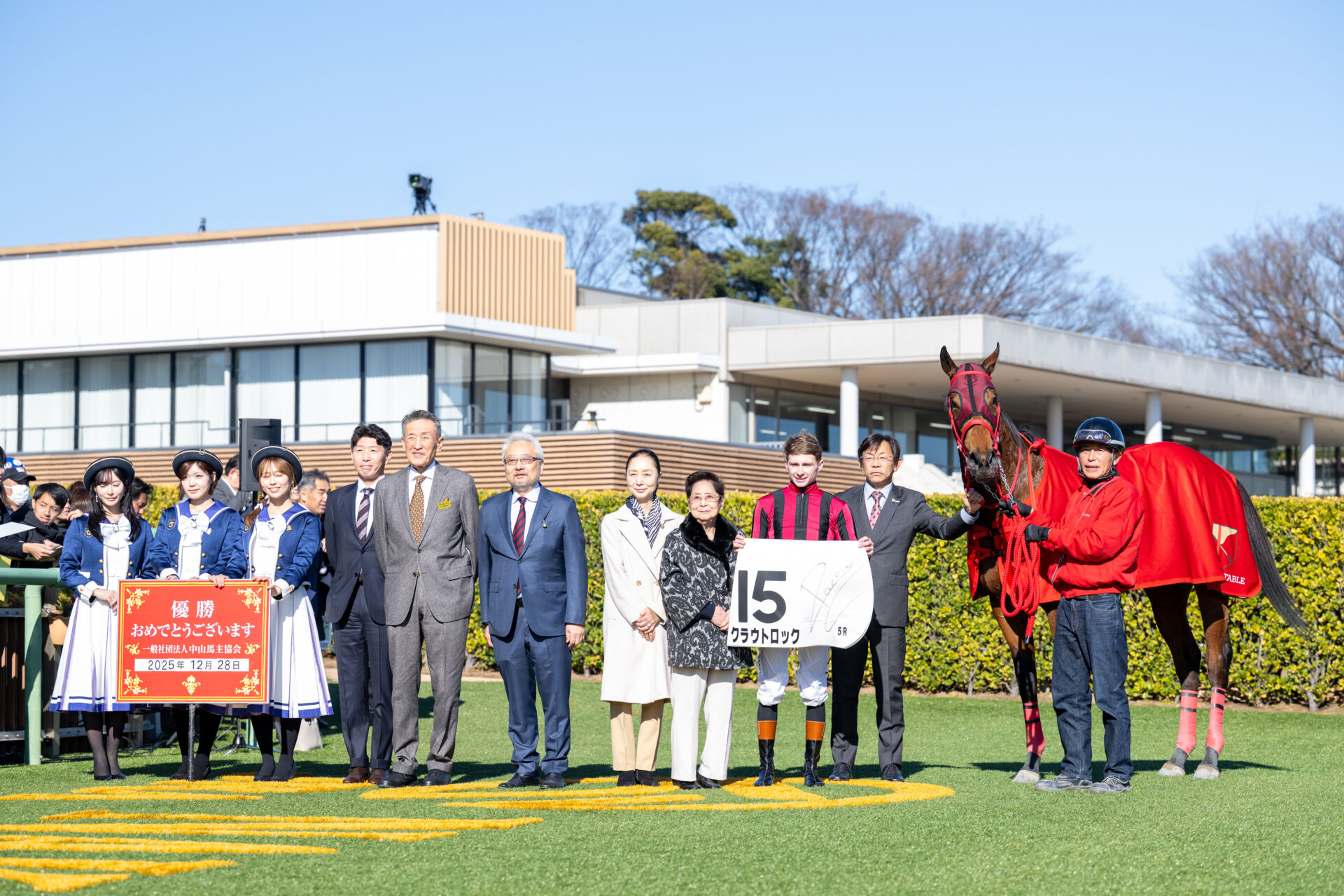 12月28日、中山競馬場で行われた5R・2歳新馬戦(ダ1800m)は、A.プーシャン騎乗の1番人気、クラウトロック(牡2・美浦・加藤征弘)が快勝した。8馬身差の2着にジェネラスキング(牡2・美浦・久保田貴士)、3着に2番人気のロードトライデント(牡2・美浦・千葉直人)が入った。勝ちタイムは1:55.7(良)。