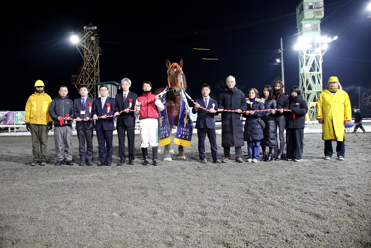 「村上調教師から依頼を受けた時は本当に嬉しかったです。今日勝つことができて本当に感謝しています。ありがとうございます。走路開放で3回騎乗し、前走まで騎乗していた藤本調教師や菊池騎手に話を聞いて馬の特徴は掴めていました。この雨だけが不安なままレースに臨みました。思っていたより息が入ったことで障害をうまく越えることができたので、粘り強さをゴール前でしっかり発揮してくれました。ゴール前は最後までわからなかったですが、本当に馬が頑張ってくれました。自分も久しぶりの重賞勝利だったのでとても嬉しかったです。今年は自分自身あまり良い成績ではありませんでしたが、最後に重賞を勝って締めくくれたので良かったです。ばんえい競馬は年が明けるとまたすぐに始まります。皆さんぜひ足を運んでいただき、応援よろしくお願いします。ありがとうございました」