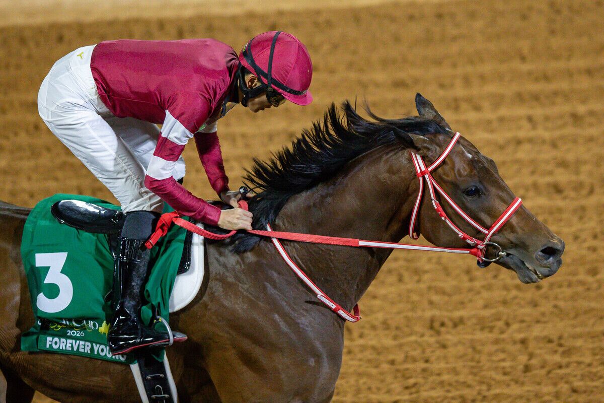 現地時間2月14日、キングアブドゥルアジーズ競馬場で行われたサウジカップデー第9R・サウジカップ(G1・ダート1800m・1着賞金1000万ドル=約15億円)は、坂井瑠星騎乗、フォーエバーヤング(牡5・栗東・矢作芳人)が優勝した。2着にナイソス(牡5・B.バファート)、3着にタンバランバ(せん6・H.アルジェハニ)が入った。勝ちタイムは1分51秒02(良)。