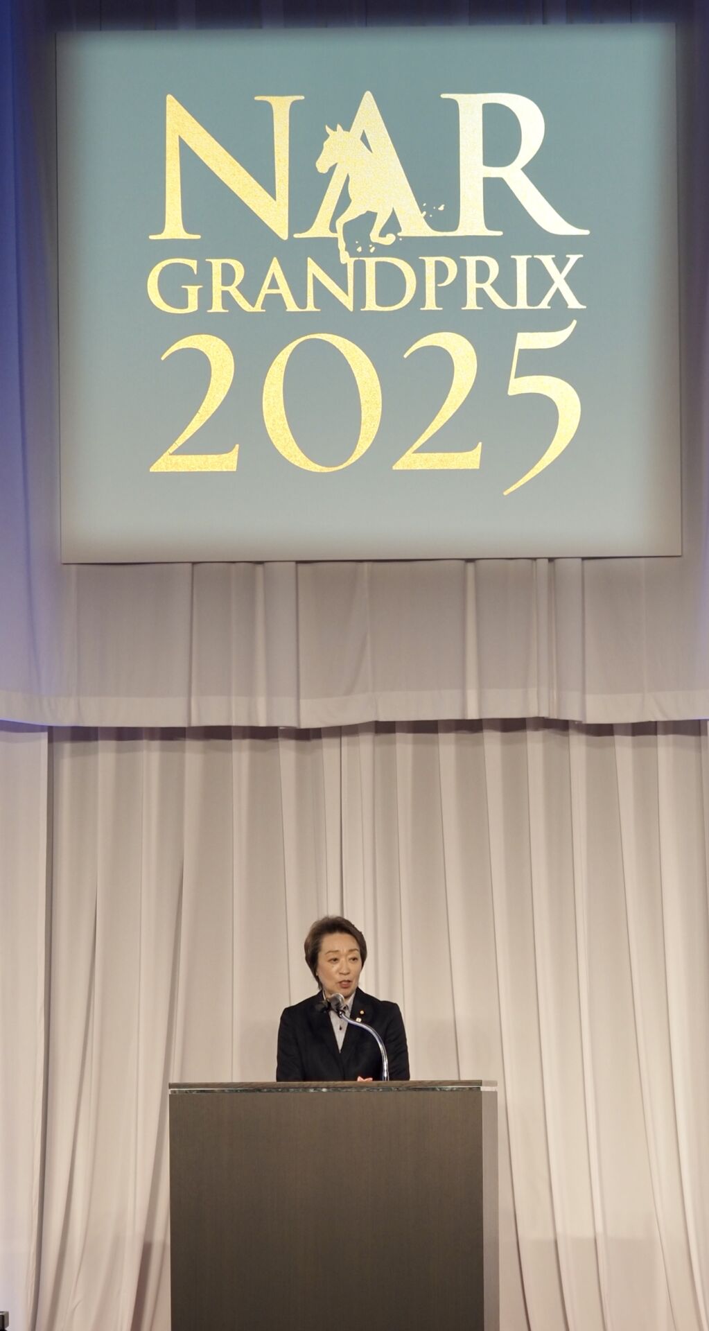 「本日はNARグランプリ2025、ご盛会を心からお慶びを申し上げますとともに、日ごろから競馬の振興に対しまして大変なご尽力をいただいておりますNARの皆様をはじめ、競馬サークルの皆様方に改めて感謝を申し上げます。本当にありがとうございます。